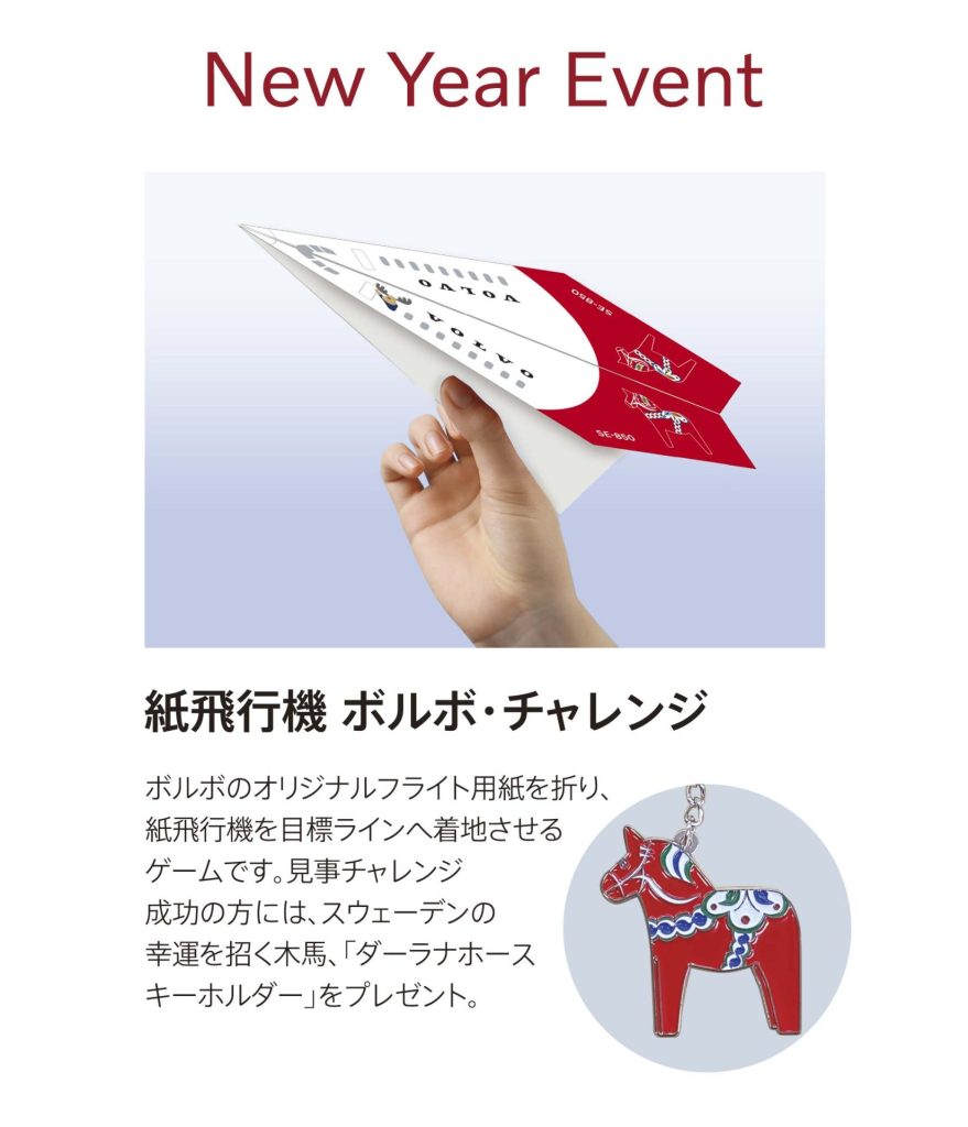 チャレンジ成功で素敵なプレゼントがもらえる紙飛行機ボルボチャレンジも実施中です。